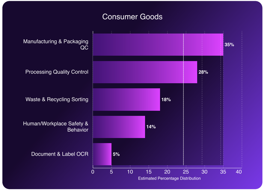 - Packaging QC (35%): Real-time verification of label placement, print quality, and seal integrity at production line speed, before products are packaged and shipped