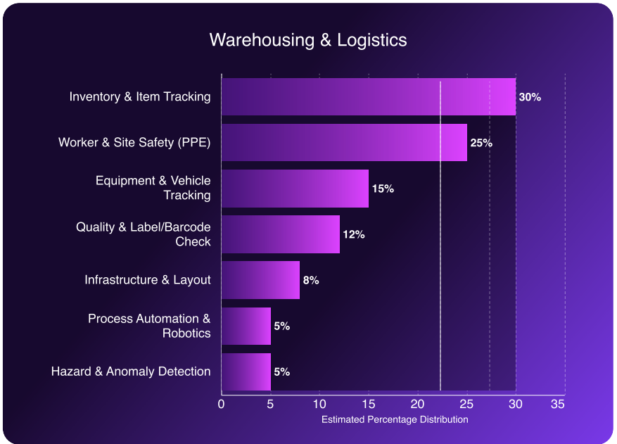 In warehouse environments, inventory and item tracking represent the largest use case at around 30%, followed by worker safety and PPE monitoring at about 25%. Many of these systems run on existing overhead camera infrastructure, so additional hardware investment is relatively small. The main operational challenge is maintaining model accuracy as the warehouse environment gradually changes over time.
